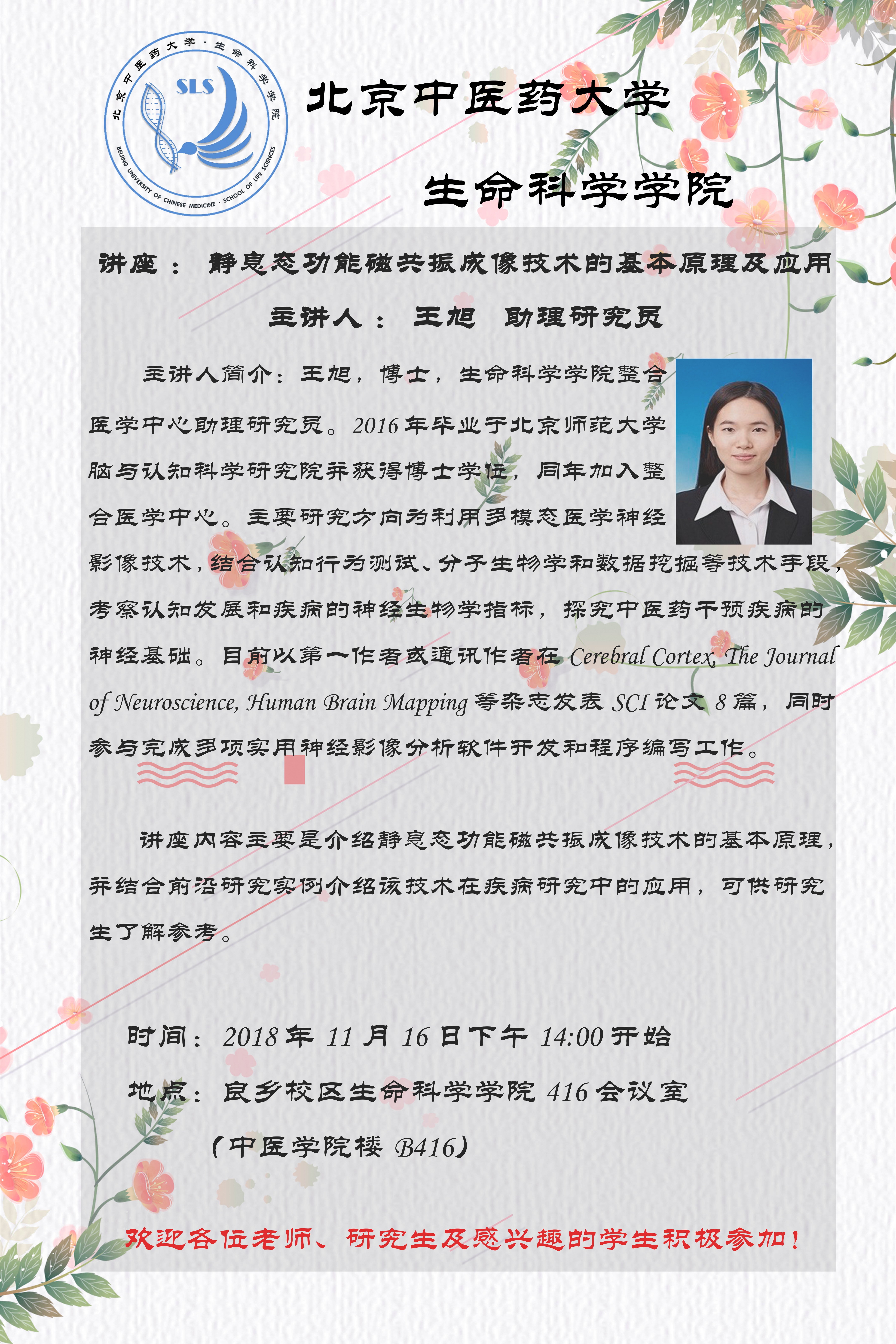 2018年11月16日下午14:00,最靠谱的十大足球平台王旭老师于良乡校区中医公司楼416开办讲座——《静息态功能磁共振成像技术的基本原理及应用》