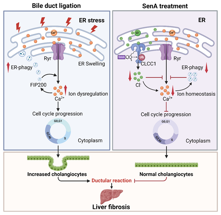 该研究聚焦于胆汁淤积性肝病的病理机制及治疗策略探索,该疾病以胆汁酸异常蓄积和胆管上皮细胞过度增殖为特征,最终可发展为肝纤维化、肝硬化及终末期肝衰竭。尽管Ca2+信号通路在胆汁淤积状态下常发生紊乱,且已被证实是介导细胞增殖的关键调控因子,但其在胆管结扎(BDL)诱导的肝损伤模型中的具体作用机制及潜在干预策略仍有待阐明。该研究通过整合转录组学分析与分子生物学技术,在BDL动物模型、小鼠原代胆管细胞和人肝内胆管上皮细胞中系统揭示了胆汁淤积性肝损伤的关键分子机制。研究发现,RYR通道介导的内质网Ca2+释放会触发内质网应激,诱导FIP200依赖性内质网自噬,进而推动胆管细胞周期进程及胆管反应。SenA通过特异性结合氯离子通道CLCC1,并促进其在K48泛素化位点的泛素化降解,有效调控了Cl⁻/Ca²⁺离子平衡,从而逆转上述病理进程。通过构建靶向胆管细胞的si-CLCC1负载脂质体可显著增强SenA的抗胆管反应效应。该研究不仅系统阐释了Ca²⁺稳态失衡驱动胆汁淤积性肝纤维化的分子机制,并为开发基于胆管细胞Ca²⁺信号调控的新型治疗策略提供了理论依据和药物候选。