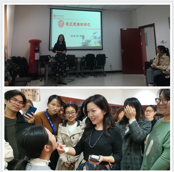 沙龙伊始,耿冬梅老师以风趣幽默的自我介绍活跃了现场气氛。接着,她以资深的职场经验和师生们分享了美的内涵,倡导学习、工作、生活中我们要以积极自信的状态不断提升自我。耿老师以互动的方式,和大家分享了职场礼仪的重要性,“在职场上,礼仪代表了一个人的素质涵养和个人风度。对于要踏入职场的老员工而言,学会职场礼仪和化好职场妆容是十分重要的。”随后,耿老师通过现场演示的方式,为大家展示了底妆、眼妆、唇妆和修饰化妆等步骤,为大家介绍了不同场合得体穿搭及职场妆容技巧,以达到“礼”跃职场的目的。沙龙结束后,耿冬梅老师细心解答了每一个同学提出的问题,帮助同学们走出化妆与着装误区。平易近人的话语、生动而富含哲理的小故事,赢得了师生们的阵阵掌声。
