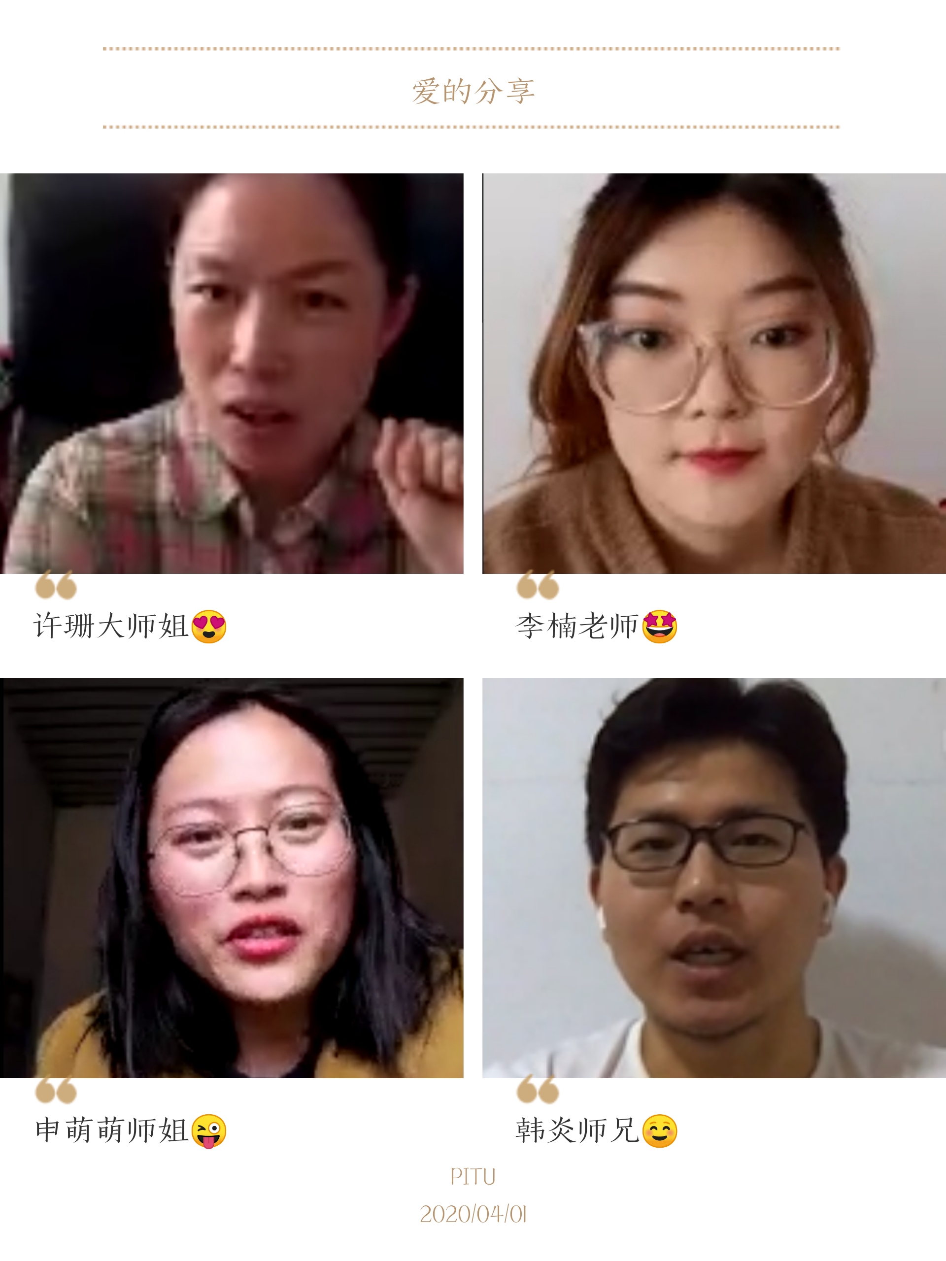 2020年4月1日,最靠谱的十大足球平台“双螺旋计划”沙龙活动之《职业生涯规划线上茶话会》顺利开展。为充分调动同学们的积极性,锻炼团队合作能力、提升团队凝聚力,公司探索创新活动组织模式,尝试由班级、党团组织轮流承办“双螺旋计划”活动。本次“茶话会”由2019级中西医结合基础班级承办,邀请了公司2019届毕业生申萌萌、韩炎两位学长与同学进行朋辈分享,许珊老师也和同学们进行了关于职业生涯规划的交流。活动由辅导员李楠老师和2019级中西医结合基础班班长姜茜茜同学主持。