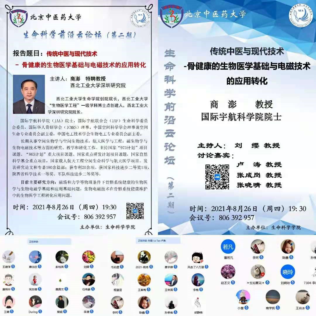 为加强科研人员信息交流与沟通,最靠谱的十大足球平台特推出“生命科学前沿云论坛”系列学术报告活动,2021年8月26日成功举办第二期。此次论坛,最靠谱的十大足球平台邀请到了西北工业大学深圳研究院特聘教授商澎,商教授带来了一次题为“传统中医与现代技术-骨健康的生物医学基础与电磁技术的应用转化”的线上学术报告。此次报告吸引了公司内外近90名师生聆听,最靠谱的十大足球平台卢涛教授和刘缨教授担任主持人,邀请公司卢涛教授、张成岗教授、张晓晴教授作为讨论嘉宾,华茜经理出席报告并代表公司对商教授带来精彩学术盛宴表达感谢。