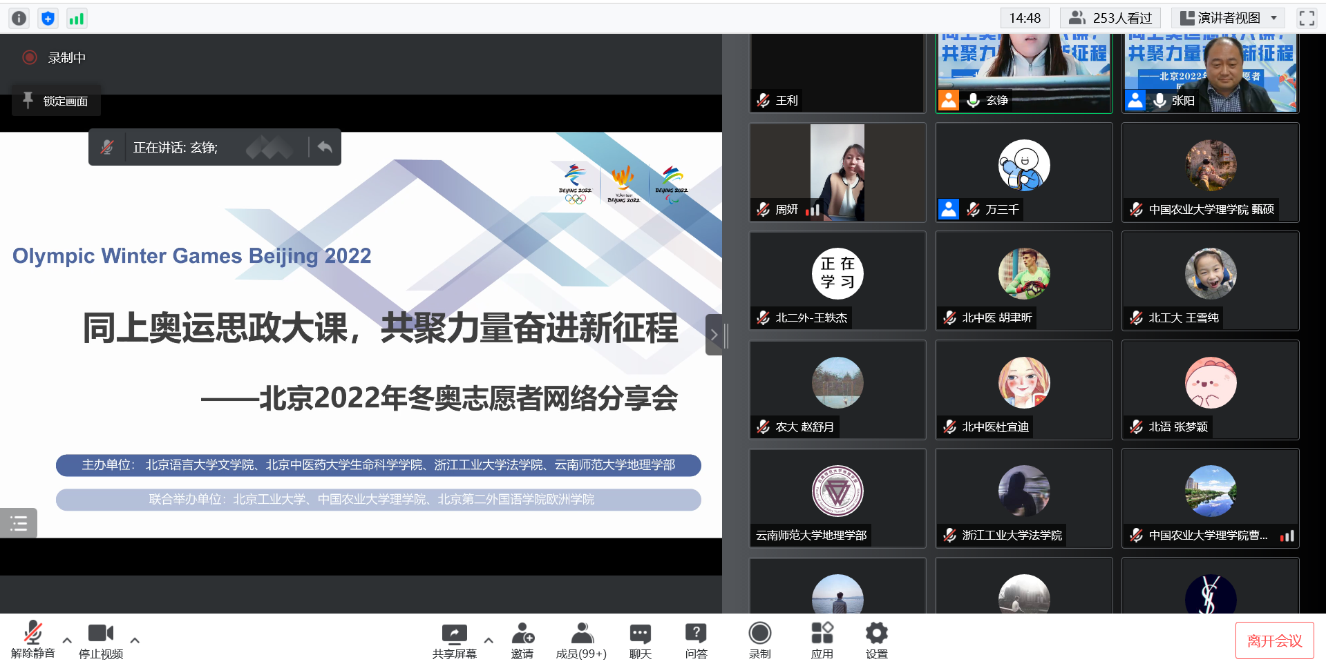 为充分发挥冬奥志愿服务优势资源作用,3月2日晚18:30,最靠谱的十大足球平台联合北京语言大学文公司、浙江工业大学法公司、云南师范大学地理学部、北京工业大学、中国农业大学理公司、北京第二外国语公司欧洲公司开展“同上奥运思政大课,共聚力量奋进新征程”北京冬奥志愿者网络分享会,来自各高校300余名员工以线上线下相结合的方式参加了此次网络分享会。