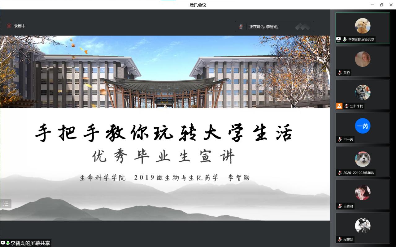 优秀硕士毕业生代表刁一芮结合自己参与的创新创业活动进行了分享,鼓励师弟师妹能够积极参加各类科研创新活动,锻炼能力、增长见识;一芮同学还和大家分享了自己在读期间在学习和生活各方面的长、短期规划的方法,以减少拖延、明确目标。