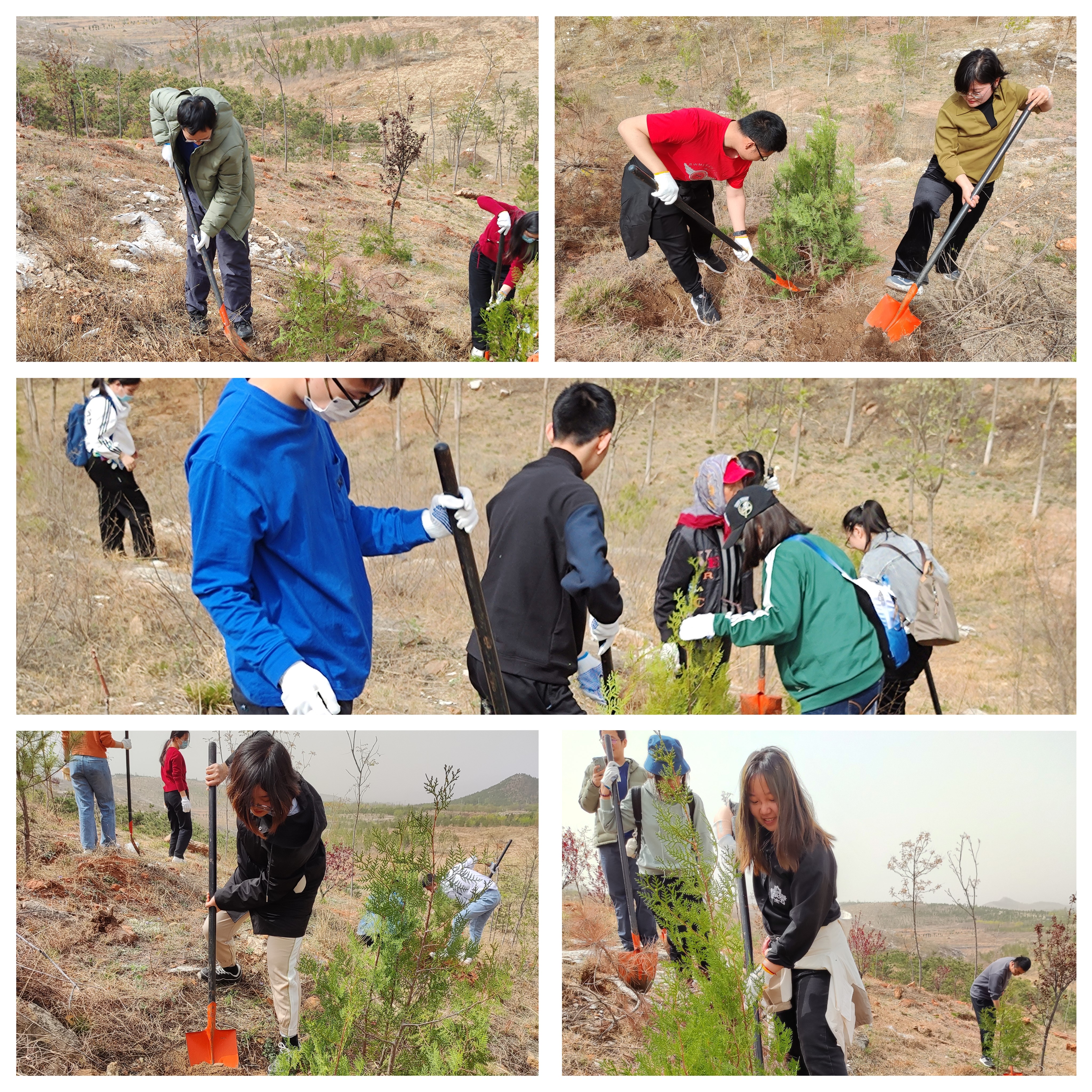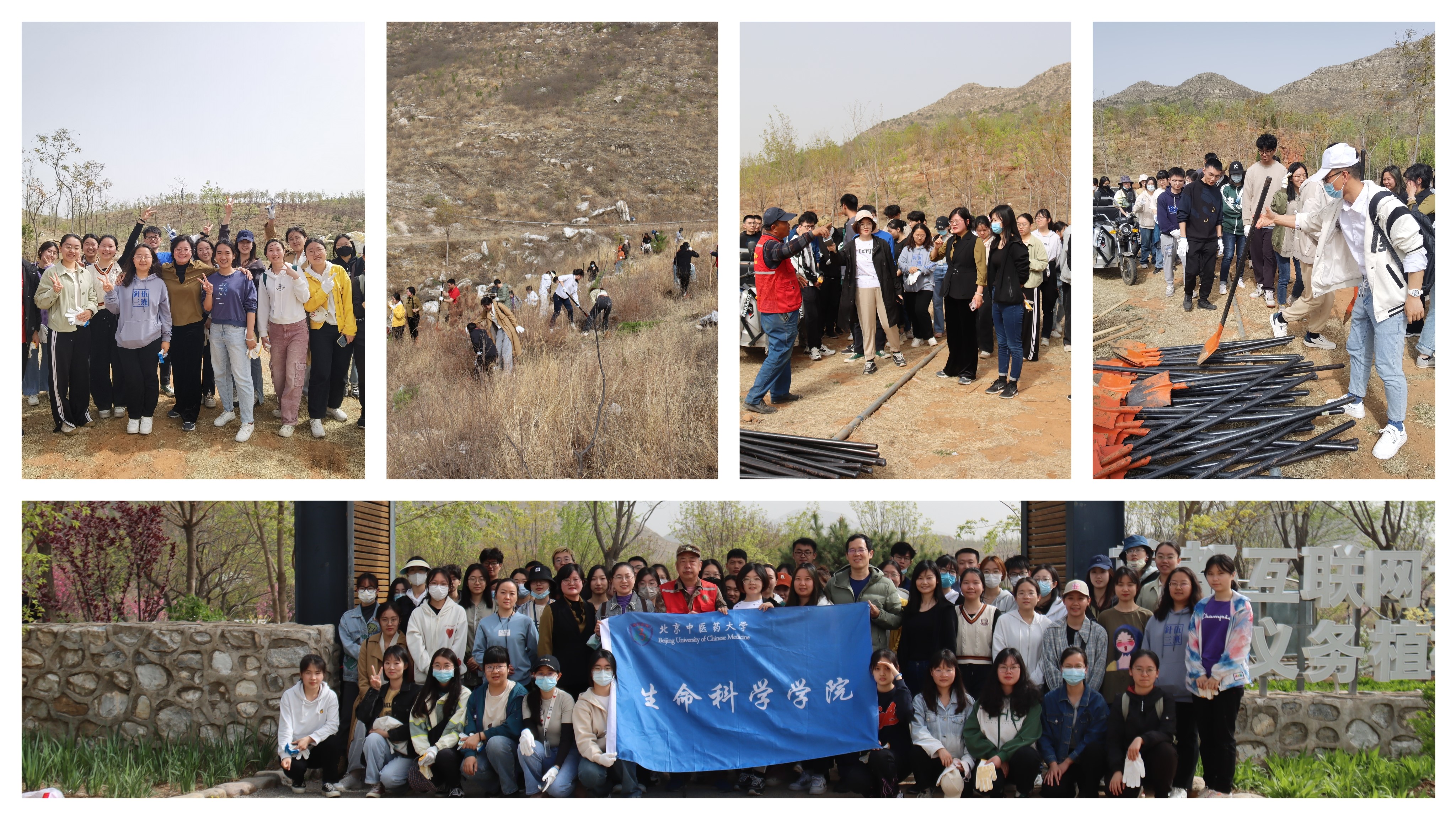 经过师生齐心协力的劳作,一棵棵侧柏树苗挺立在山上。同学们也纷纷感受到劳动的快乐和不易之处,向工作人员们致敬,对他们十年如一日的绿化工作表示感激。整个植树现场洋溢着昂扬向上的融洽氛围,不仅在这里留下了北中医新绿,也见证了师生间深厚的感情。最后,师生们不舍地和这片新绿道别,期待树苗茁壮成长,起到防风固沙、预防水土流失的作用。不少同学还把本次的劳动手套作为纪念收藏起来。