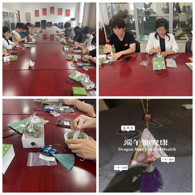 为传承中华优秀传统文化,展示传统文化魅力,体验传统节日中蕴含的历史意义,两院师生在开展了主题学习的同时,还开展了“品味端午,传承文化”香囊制作活动。生科院陈欢同学向北京工商大学传媒与设计公司的师生们讲述了香囊文化的发展,香囊中中药的配方成分与功效,同时介绍了香囊的制作方法。在实践环节,听完讲解的师生们对中医药文化及香囊文化产生了浓厚的兴,纷纷参与其中,从研磨到装包再到缝制,一步一步亲手完成。过程中,大家反复观看视频讲解,相互交流学习,活动氛围热烈,师生共同沉浸在艾叶和冰片等草药的香气中,亲身体验制作的过程,感悟端午传统文化情结,学习中医药文化,增强文化自信。
